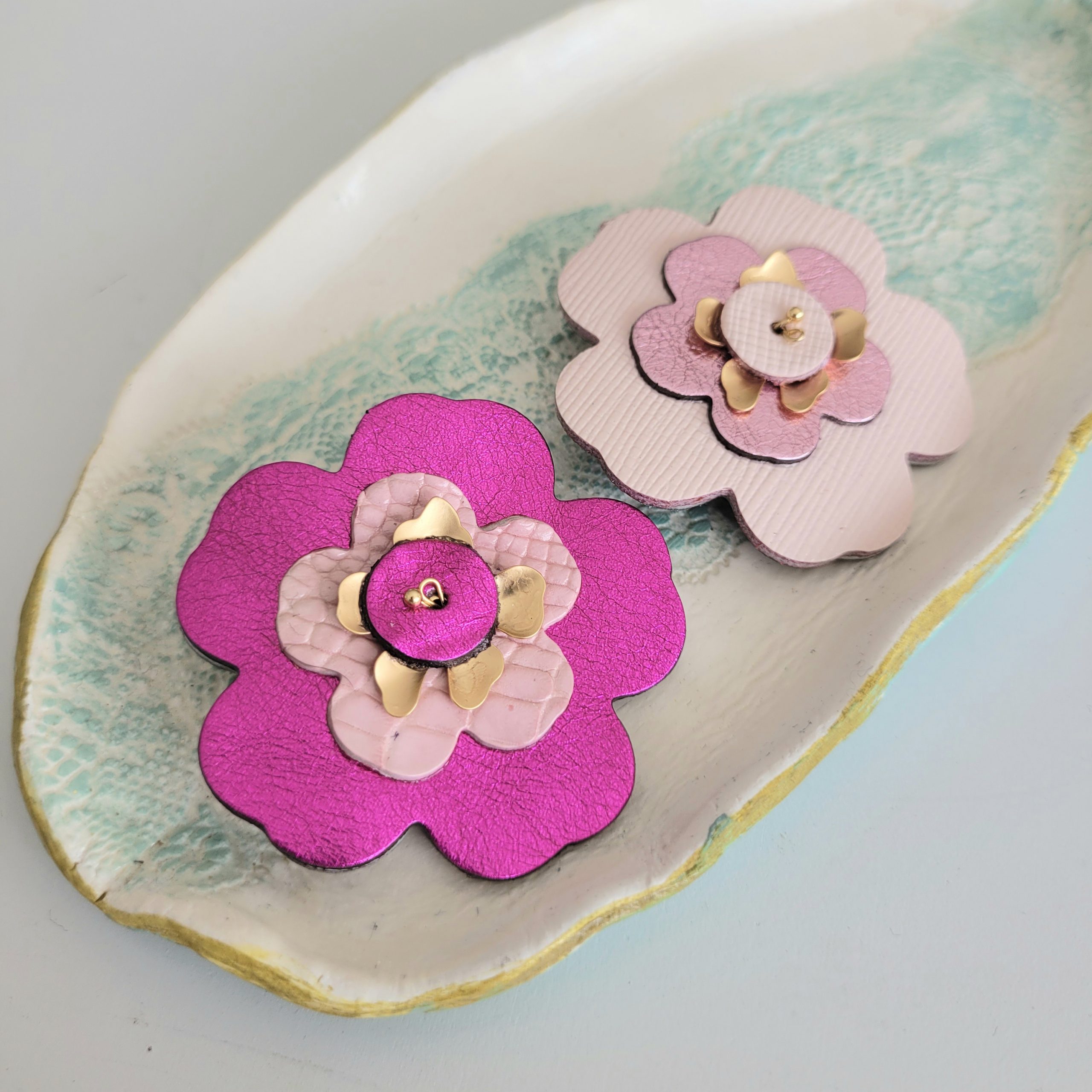 Broche cerisier en cuir recyclé dans les teintes de rose fuchsia et rose pale cœur en plaqué or accessoire femme bijou