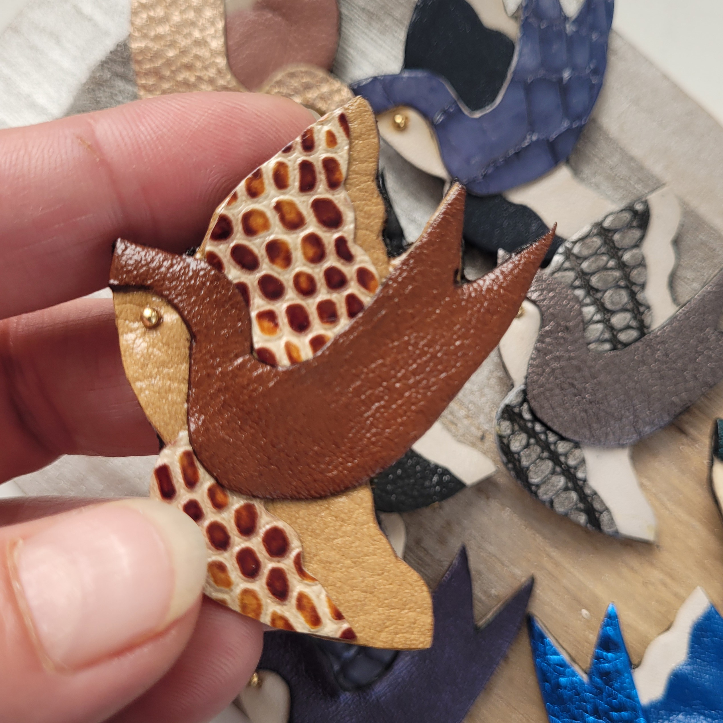 Broche hirondelle léopard en cuir recyclé et plaqué or