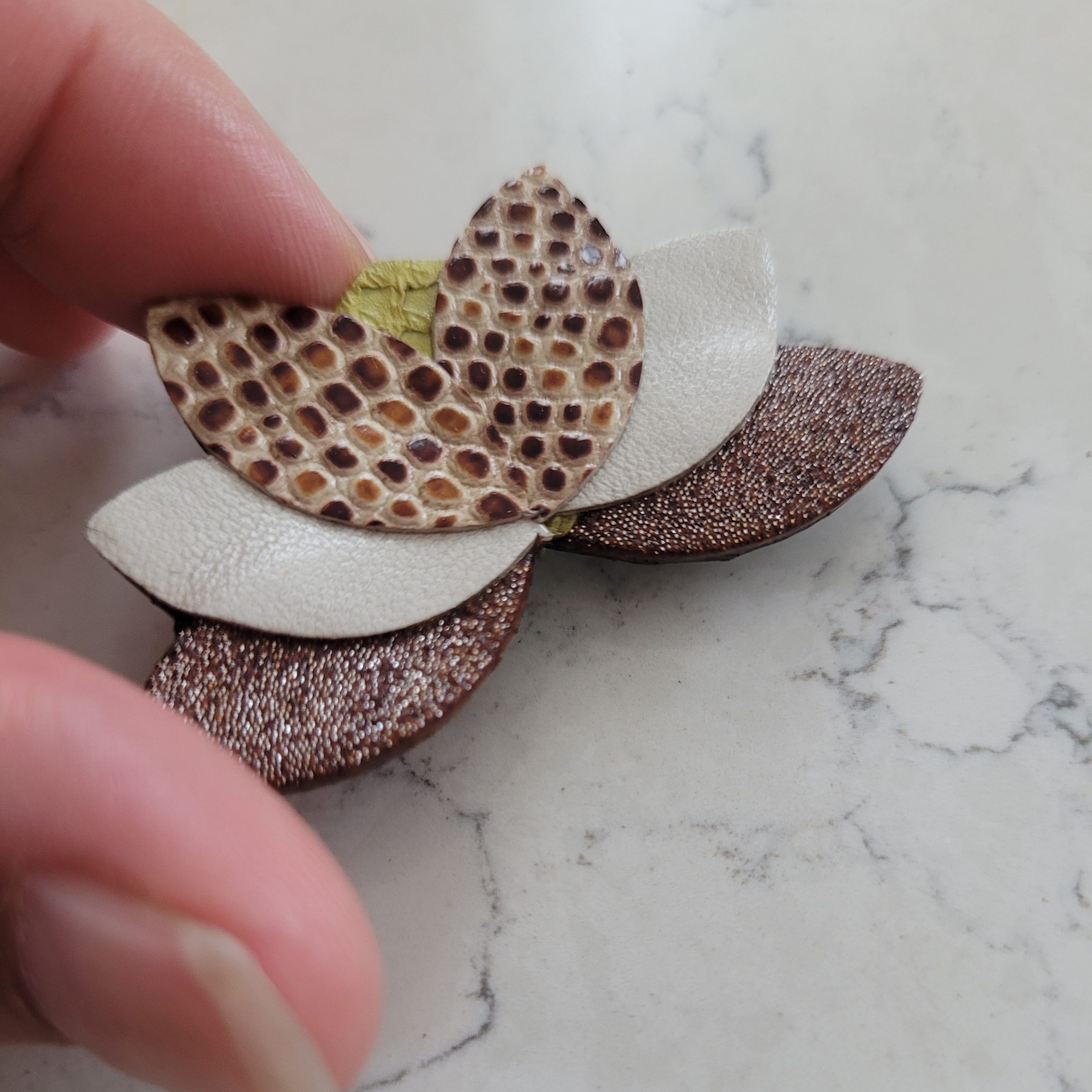 Cette broche est réalisée en cuirs recyclés, issus des surplus de maroquineries, je travaille donc avec de petite quantité au coloris.