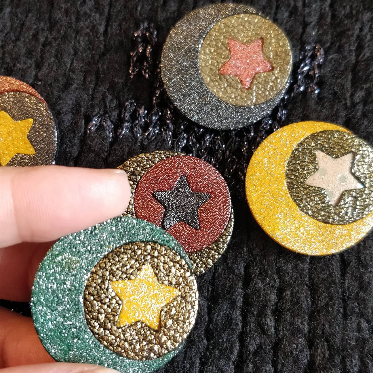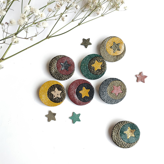 Cette broche moon est réalisée en cuirs recyclés, issus des surplus de maroquineries, je travaille donc avec de petites quantités au coloris.