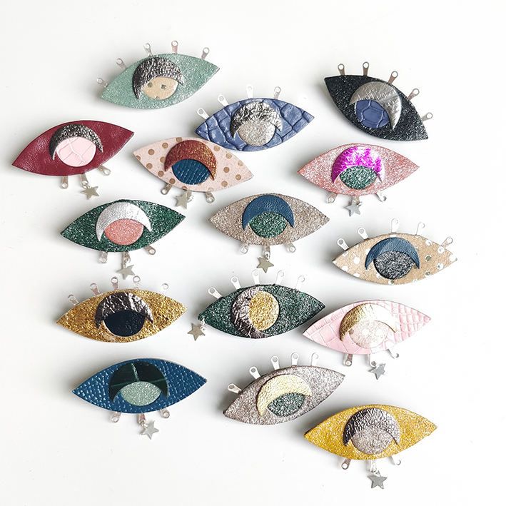Cette broche est réalisée en cuirs recyclés, issus des surplus de maroquineries, je travaille donc avec de petite quantité au coloris.