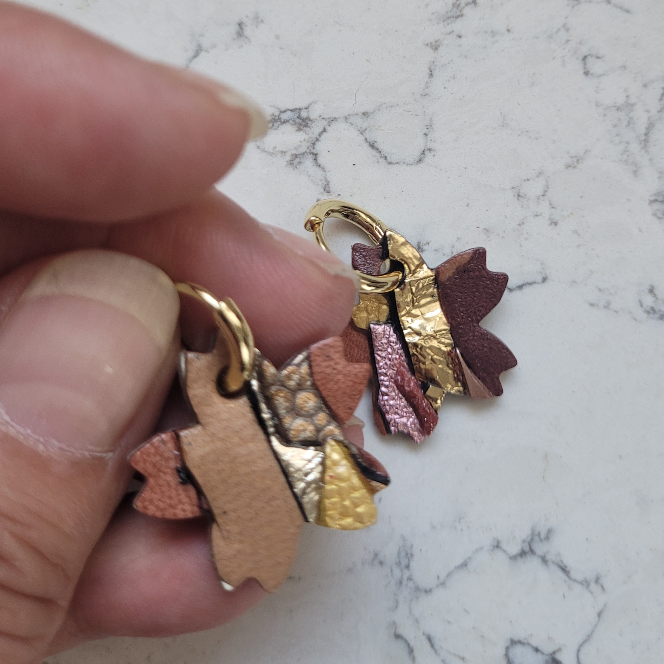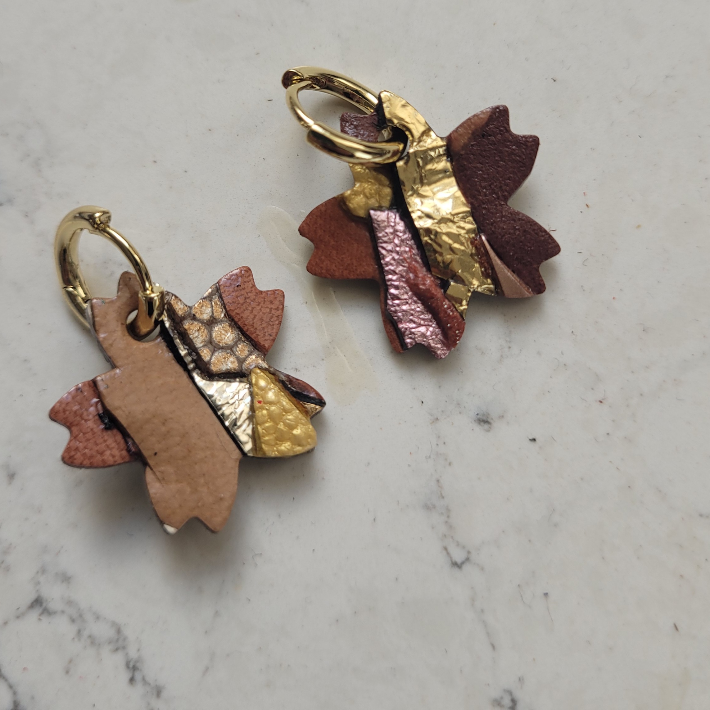Petites créoles en plaqué or et pampille fleur de cerisier en cuir réemployé et recyclé fabriquées en France