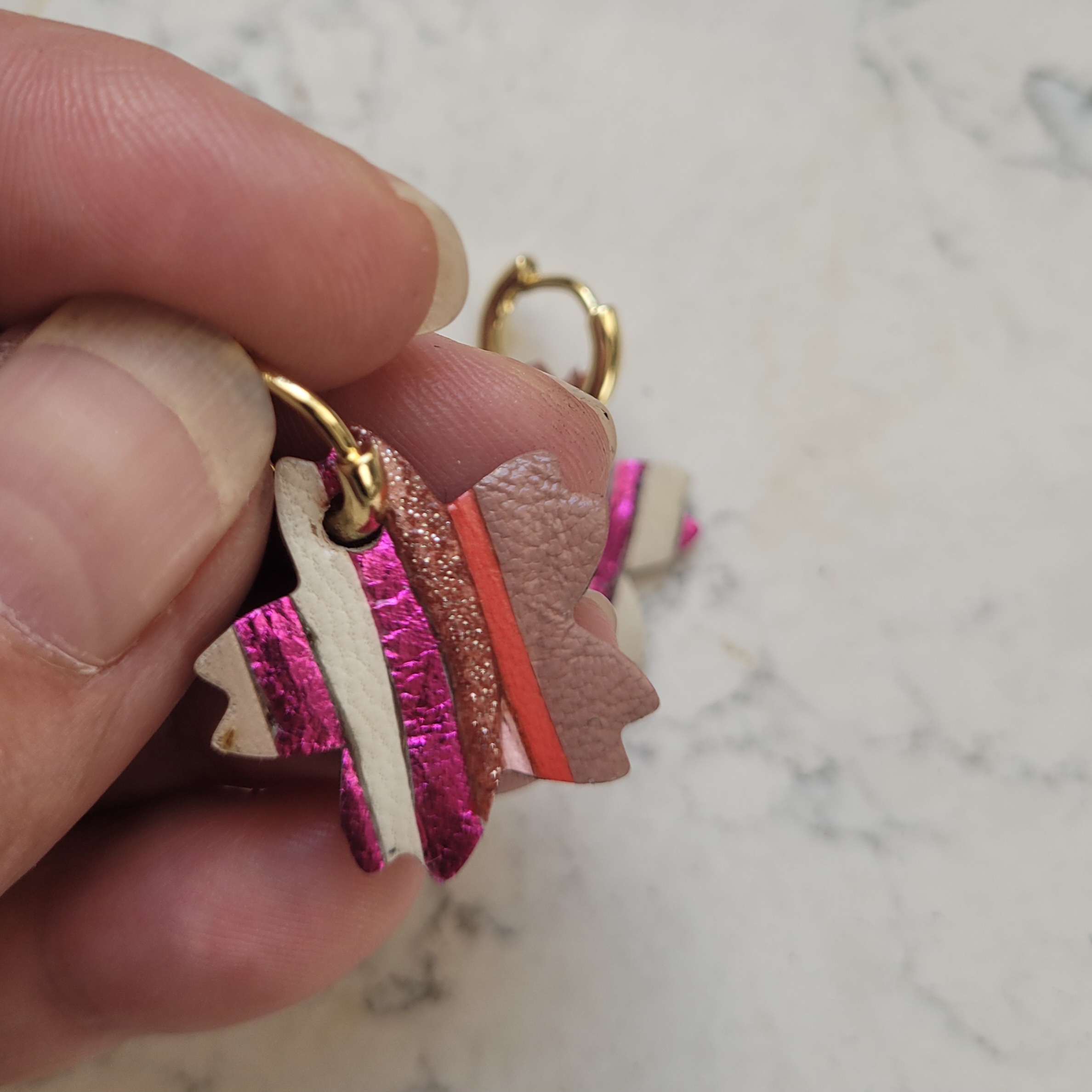 Petites créoles en plaqué or et pampille fleur de cerisier en cuir réemployé et recyclé fabriquées en France